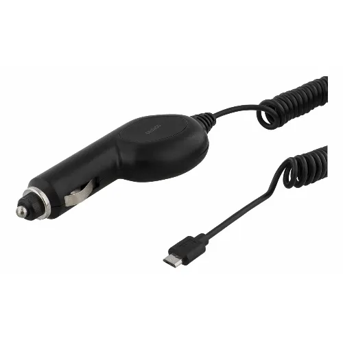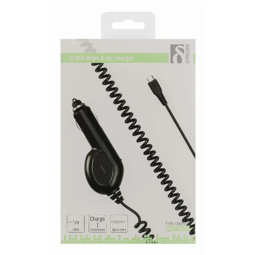 DELTACO Autolaturi, Micro USB, 1A, 12-24V, 1m kierrekaapeli, musta