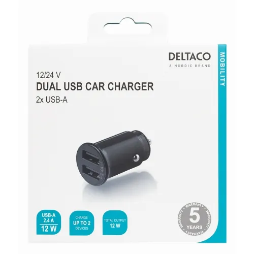 DELTACO kompakti USB-autolaturi, 12V/24V, 2x USB-A, 2,4A, 12W, musta