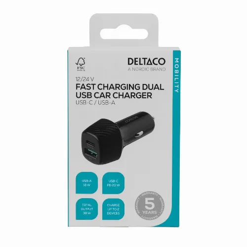 DELTACO USB-autolaturi, 1x USB-C, PD 18W, 1x USB-A, 18W, yhteensä 36W