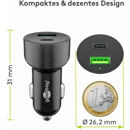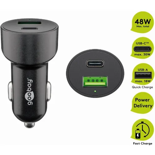 Goobay Kaksois-USB-autolaturi USB-C™ PD (Power Delivery) (48 W) 48 W (12/24 V) USB-A/USB-C™ soveltuu USB-C™ (Power Delivery) -laitteille, esim. iPhone 12