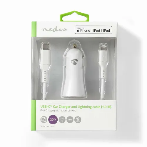Nedis Autolaturi | 20 W | 1.67 / 2.22 / 3.0 A | Lähtöliitäntöjen määrä: 1 | Portin tyyppi: USB-C™ | Lightning 8-Pin (irrallinen) Kaapeli | 1.00 m | Automaattinen Jännitteen Valinta
