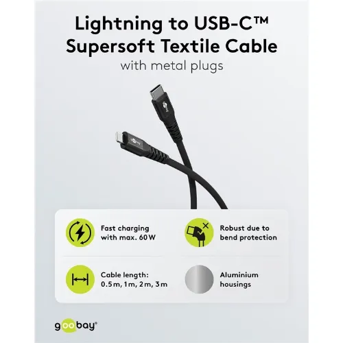 Goobay Lightning-USB-C™ supersoft textilkabel med metallkontakter, 2 m, svart MFi-certifierad, elegant och extra robust laddnings- och synkroniseringskabel för Apple iPhone/iPad (svart)