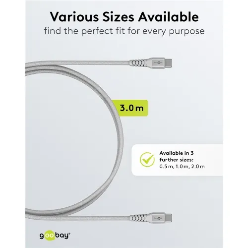Goobay USB-C™ supersoft textilkabel med metallkontakter, 3 m, vit elegant och extra robust anslutningskabel för enheter med USB-C™-port