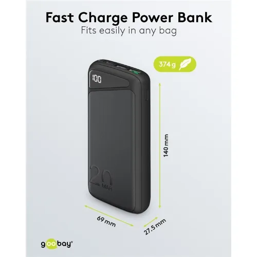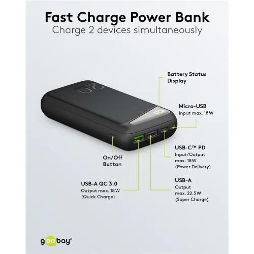 Goobay Snabbladdning Powerbank 20.000 mAh (USB-C™ PD, QC 3.0) Kraftfull powerbank med statusdisplay, kompatibel med Quick Charge