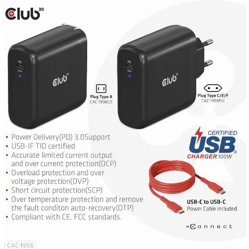 Club 3D CAC-1908EU Travel Charger 100 W GaN USB-C -virtalähde