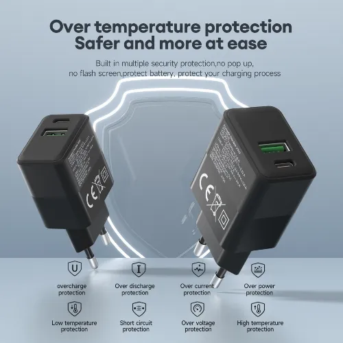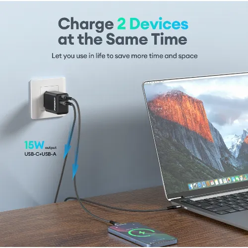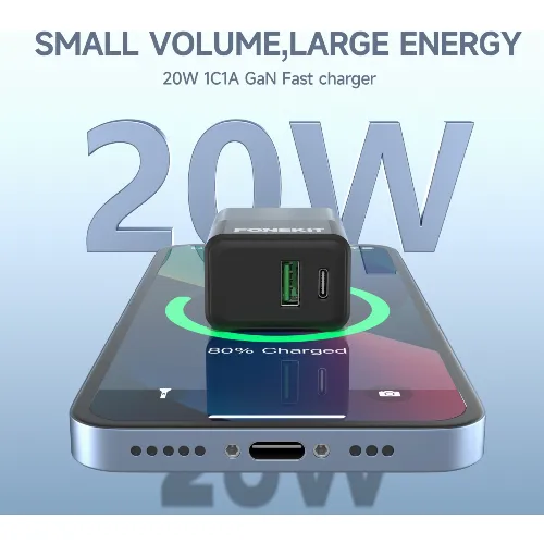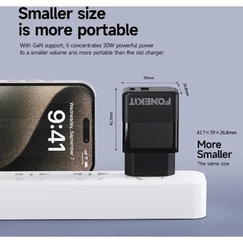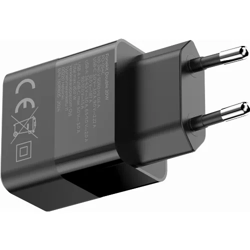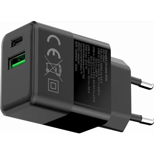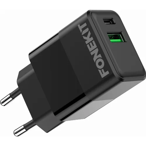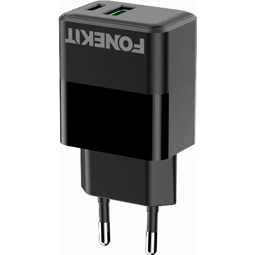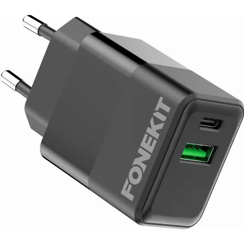 FoneKit Double 20W -laturi, USB-C + USB-A, musta