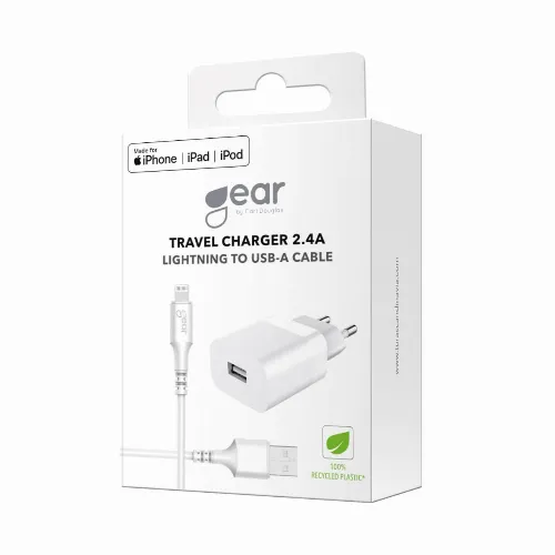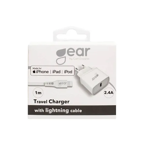 Gear Laturi 220V 1xUSB-A 2,4A Valkoinen Lightning Johto 1m MFI C89