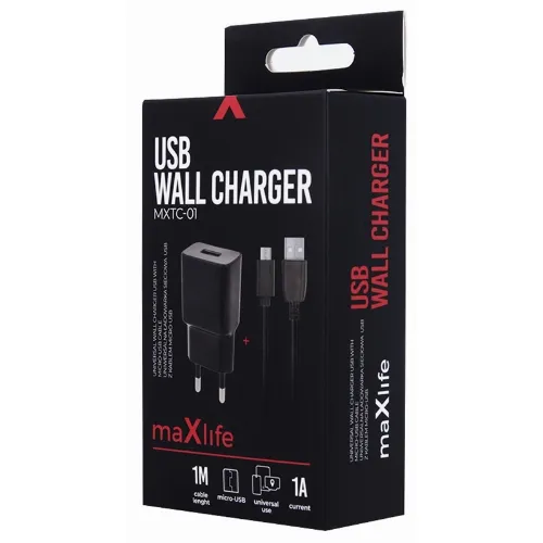 Maxlife seinälaturi MXTC-01 USB (1A) + microUSB-kaapeli, musta