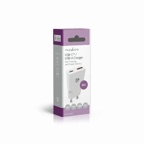 Nedis Seinälaturi | 30 W | GaN | PD3.0 | 1.5 / 2.0 / 2.5 / 3.0 A | Lähtöliitäntöjen määrä: 2 | USB-A / USB-C™ | Automaattinen Jännitteen Valinta | Valkoinen
