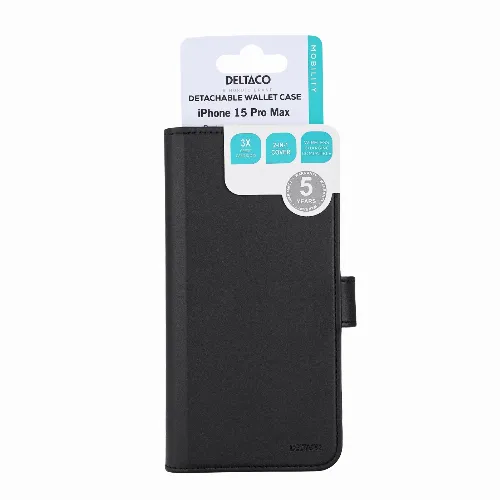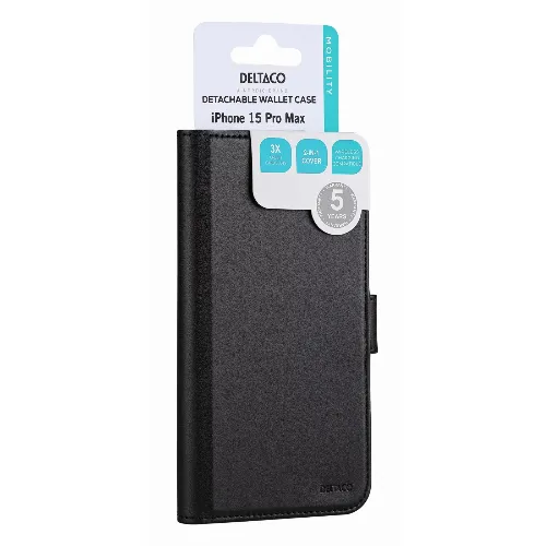 DELTACO Wallet case, 2-in-1, iPhone 15 Pro Max, magnetic cover,black