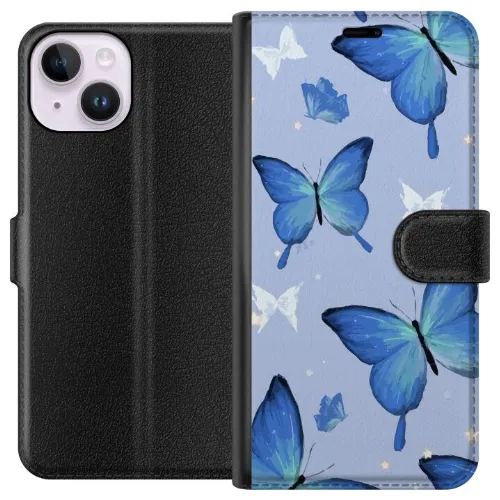 Lompakkokotelo Apple iPhone 14-laitteelle, jossa on Sinisiä perhosia kuvio