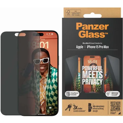 PanzerGlass Privacy Ultra Wide Fit -lasikalvo, iPhone 15 Pro Max, musta kehys